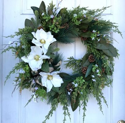 Wreath with magnolia silk flowers, long pine needle, pine cones, pine needle and pine cone bow.