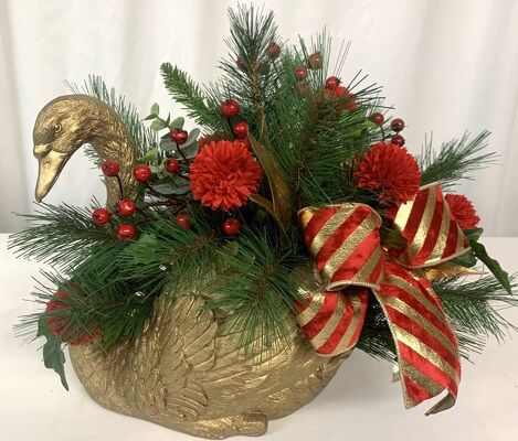 Golden swan with greens, silk carnations, and red and gold striped bow.