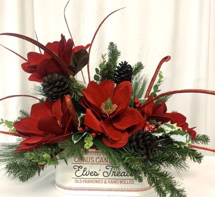 Cute tin with lid containing greens and silk poinsettias. Tin reads, Claus Candy Shop, Elves' Treats, Old Fashioned and Hand Rolled.